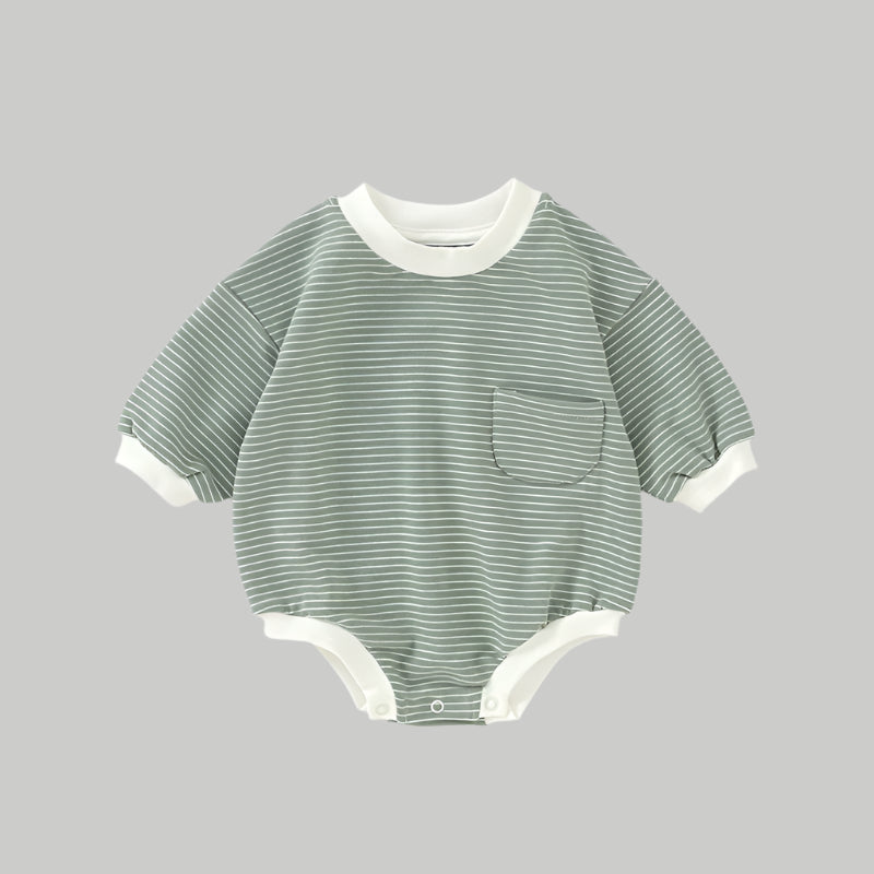 Crafted from a premium blend of 95% organic cotton and 5% spandex, this French Terry bubble romper delivers everyday comfort with a gentle stretch. The yarn-dyed stripes lend a playful, timeless feel, while contrast ribbed cuffs and neckline add a modern edge. Featuring an elasticated leg opening for a sweet bubbled silhouette and easy snap closure at the crotch for quick changes, it’s designed for little ones on the go. Finished with a charming chest pocket, this romper is an effortless wardrobe staple for your mini adventurer.