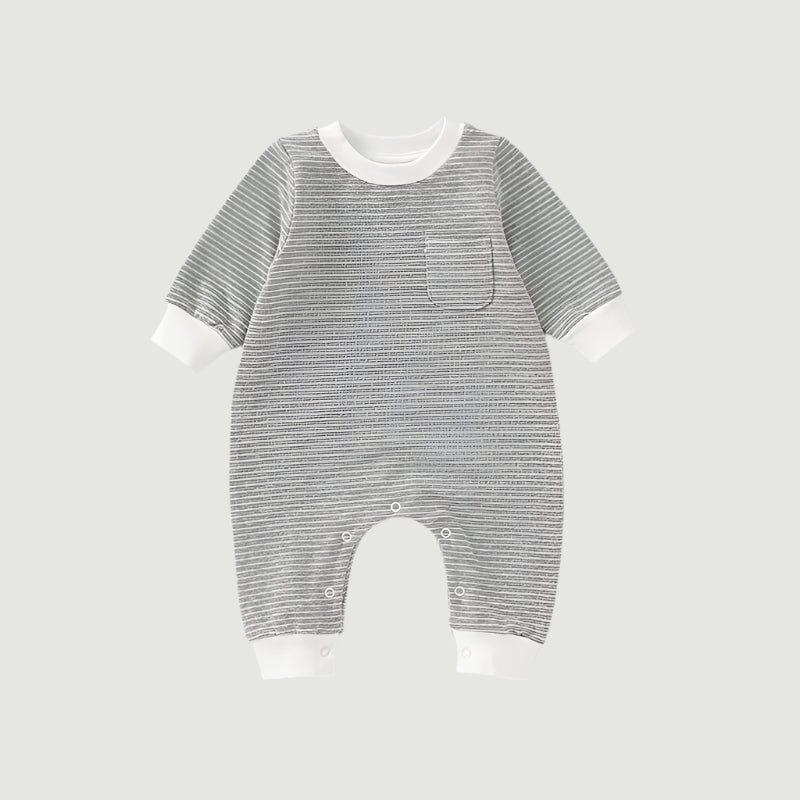 Made from a premium blend of 95% organic cotton and 5% spandex, this French terry romper offers all-day comfort with just the right amount of stretch. The yarn-dyed stripes bring a timeless, playful look, while the contrast ribbed cuffs and neckline add a modern touch. Designed with practicality in mind, it features an easy snap closure at the crotch for quick nappy changes and a sweet chest pocket for a hint of charm. A comfortable, easygoing essential for little ones on the move.